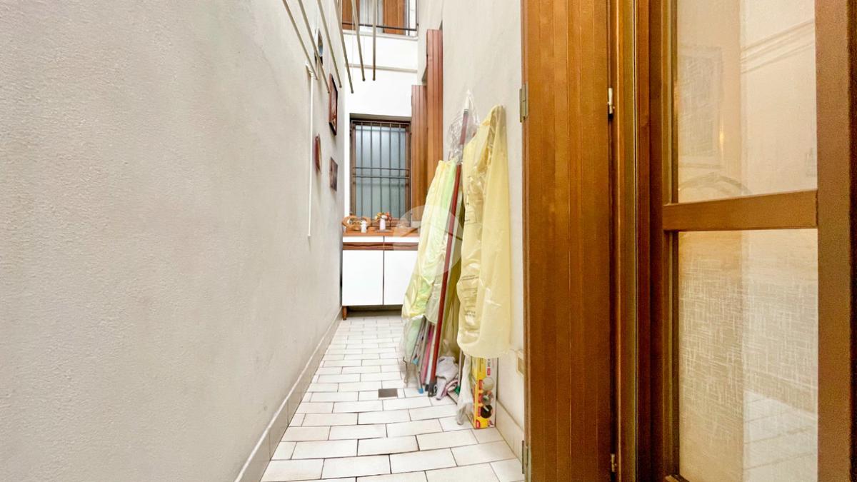Proseguendo attraverso il disimpegno si accede alla zona notte, composta da un bagno finestrato con vasca, sanitari e attacco per la lavatrice, e da una camera matrimoniale di circa 13 mq. Dalla camera si ha accesso a un cavedio esterno coperto, uno spazio estremamente pratico da utilizzare come zona stenditura, deposito per bidoni, stendini o ripostiglio per scope e accessori.